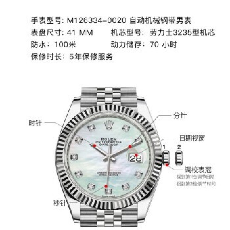 Swiss Rolex Watch Datejust 41 Series Automatic Mechanical Men's Watch M126334-0020 White Pearl with Diamond Five-Grid Chain 4980.0 |